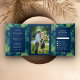 Amaze seus hóspedes com esse tema tropical elegante todos em um convite de casamento com tipografia moderna sobre folhas verdes e folhagem. Basta adicionar os detalhes do seu evento neste modelo fácil de usar e enfeitar este cartão com a sua foto favorita para torná-lo um convite único.
