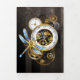 Marcações antigas com engrenagens de ouro e latão, decoradas com libélula mecânica sobre fundo castanho e listrado. Steampunk.