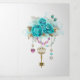 Chave de ouro antiga com rosas de turquesa de tendência, decoradas com folhas de ouro branco e miçangas cor-de-rosa e azuis. Cor agradável. Rosas de turquesa. Ouro branco. Tifania azul.
