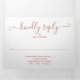 Trecho de convite para casamento, tudo em um terracotta, com tipografia elegante. O convite inclui os detalhes das informações de convidado de celebração e um cartão RSVP destacável. Projetado por Thisnotme©