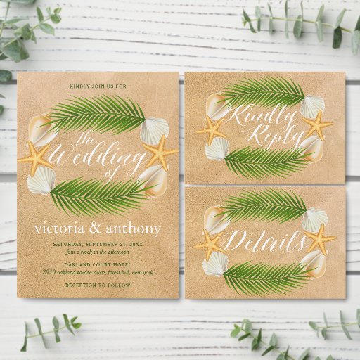 Convite Com Dobra Tripla Tropical Wreath Sandy Beach Wedding Suite