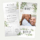 Elegante 3 em 1 convite triplo de casamento verde apresentando um fundo branco na moda, folhagem verde-aquática botânica, sotaques dourados, uma foto da noiva e noiva, seus detalhes de casamento, um convite de casamento e um cartão postal de entrada de comida rsvp para seus convidados cortarem e enviarem de volta.