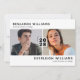 Convites modernos de festa de formatura em preto e branco com um simples fundo branco que pode ser mudado para qualquer cor, duas fotos dos formandos e um modelo moderno de dupla celebração que é fácil de personalizar. Você pode ajustar o texto na parte de trás do convite de formando para fazer isso em um anúncio de graduação.