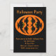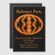Este incrível convite de festas magnético apresenta um oval laranja com seis corvos. Cada corvo tem olhos amarelos com pupilas pretas e asas salientes. Os corvos voam em direção uns aos outros formando uma forma oval. O fundo é preto.