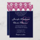 Este design cor-de-rosa, do branco e dos azuis marinhos do damasco faz um convite elegante do casamento, e é caracterizado atualmente em um papel metálico hued do gelo que dê a seu convite um shimmer e um fulgor especiais. Você pode experimentar com os tipos de papel diferentes para obter apenas o olhar que você quer.