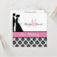 Impressão preto e branco do damasco com uma banda cor-de-rosa, uns noivos da silhueta, e áreas que você pode personalizar com seus nomes, inicial do monograma, cerimónia de casamento e informação da recepção em um convite wedding personalizado que seja elegante e tradicional tudo em um! Enrole para baixo para selos de harmonização do casamento.