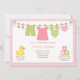 Este convite bonito do chá de fraldas caracteriza um pato de borracha bonito e uma roupa do bebê, umas meias e um babador cor-de-rosa e verdes em um clothesline da lavanderia. Este convite moderno e elegante do chá é perfeito para que toda a mamã seja.