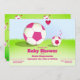 Um convite do chá de fraldas do futebol/futebol. O convite mostra uma bola de futebol cor-de-rosa e uma bola de futebol cor-de-rosa do bebê, uma grama verde, e um céu azul. Todas as palavras podem ser personalizadas.