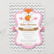 Convide seus amados a um chá de fraldas doce que honra mãe-à-estar com este convite adorável da raposa. Fundo cinzento da viga das características e uma raposa alaranjada feliz.