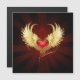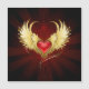 Coração vermelho brilhante de um anjo com asas ouros brilhando no fundo vermelho-radiante escuro decorado com um padrão.