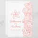 O desenho de esboço no coral de uma estrela do mar/seastar simples, com a onda gráfica do mar roda, rosa alaranjado bonito nos convites litorais brancos do casamento de praia. Um perfeito convida para uma praia, um oceano litoral inspirado, ou um casamento do destino do mar do oceano. Edite estes convites com suas próprias palavras do nome e do convite. Desenho original e design por Sarah Trett. www.sarahtrett.com para www.mylittleedenweddings.com