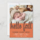 Anúncio de nascimento de outono apresenta uma foto de seu bebê recém-nascido na metade superior. A metade inferior é uma laranja temperada profunda. Olá Outono está escrito em uma fonte moderna de roteiro grande em roxo profundo. O nome do bebê está escrito no mesmo roxo. Sua data de nascimento e estados de nascimento estão em um texto branco simples. Me avise se você precisar de produtos correspondentes.