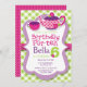 Começo que embebe o chá e que derrama o creme, é hora para um aniversário do tea party! Este convite caracteriza um grupo de chá lunático cor-de-rosa e roxo com um fundo verde bonito do guingão.