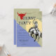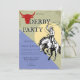 Celebre uma divertida festa de derby com tema western com este convite de cavalo de cowboy ousado. Este design em estilo vintage apresenta um cowboy clássico montando um cavalo com elementos ocidentais rústicos, criando o convite perfeito para uma festa de derby, celebração com tema de cavalos ou encontro com estilo western.
