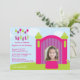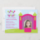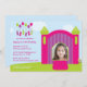 A festa de aniversário desta menina 5x7 convida tem um rosa, um verde, e um bouncehouse das listras do roxo no direito com sua informação facilmente customizável do partido à esquerda. Há um lugar para que você adicione sua própria fotografia dentro da casa. Estúdio do cacau