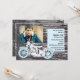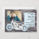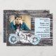 Um convite masculino para o entusiasta da motocicleta. As características de design um fundo afligido preto e branco com um ciclo azul e branco, sua foto e um painel azul para seus sentimentos. Aperfeiçoe para todo o homem da idade.