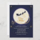 Um fundo azul da meia-noite caracteriza a silhueta do trenó e da rena do papai noel na lua completa, branca. O "Feliz Natal" é pré-imprimido no ouro. Bem-serido para alguma celebração do Natal.