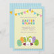 Um convite à refeição matinal da páscoa, nas cores pastel bonitas, caracterizando um coelho que sai de seu burrow com ovos da páscoa e as bandeiras coloridas contra um fundo listrado azul.