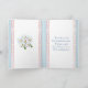 Noiva esbelta em vestido branco com véu delicado com margaridas e segurando um buquê de flores.