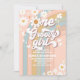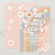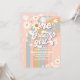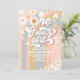 Celebre o marco do seu pequeno com este convite de primeiro aniversário retrô e descolado, apresentando listras de arco-íris pastel, margaridas alegres, borboletas, estrelas e corações. Perfeito para uma festa com tema inspirado nos anos 70, este design colorido define o tom para paz, amor e diversão. Personalize com o nome da criança, detalhes da festa e informações de RSVP para criar um souvenir único. Ideal para aniversários de meninas, este convite vibrante em estilo boho adiciona charme e nostalgia à sua celebração.