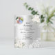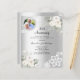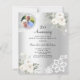 Para um elegante e romântico aniversário de 25. Um fundo com aspecto fino prateado decorado com flores, rosas e rendas brancas. Personalize e adicione sua foto, nomes e detalhes. 1 folha = 1 convite impresso de borda a borda.