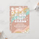 Celebre o dia especial do seu pequeno com este convite de 3º aniversário inspirado no estilo retrô, apresentando ondas pastel divertidas, sinais de paz, margaridas, corações e estrelas. O design ousado e hippie captura uma vibe boho divertida perfeita para crianças que amam temas coloridos e alegres. Personalize com o nome da criança, detalhes da festa e informações de RSVP para criar um souvenir único. Este convite de aniversário é ideal para festas de meninas, celebrações retrô e eventos temáticos boêmios.