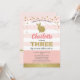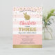 Convite de festa temática de coelho fofo rosa e dourado para 3º aniversário da menina.