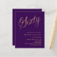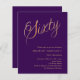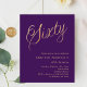 Um convite moderno e na moda para uma 60ª festa de aniversário. Um fundo de cor púrpura e a palavra Sessenta escrita com letras elegantes e grandes em dourado falso. Personalize e adicione um nome e detalhes da parte. 1 folha = 1 convite impresso de borda a borda.