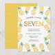 Faça uma festa de 7º aniversário tropical para o seu filho! Este adorável convite de aniversário apresenta abacaxis em aquarela e 'sete' em dourado falso, que é moderno e está na moda. Convide com estilo! Todos os detalhes, exceto a idade, são personalizáveis. Veja a coleção abaixo para mais idades!