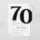 O convite de aniversário minimalista preto e branco moderno e elegante apresenta o na moda número 70. Excelente surpresa de aniversário para adultos para homens e mulheres.