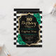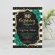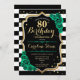 Convite de festa de 80º aniversário. Design floral elegante em verde esmeralda com dourado brilhante falso e rosas. Apresenta listras pretas e brancas e fonte cursiva. Perfeito para uma celebração de aniversário de mulher elegante. Pode ser personalizado para qualquer idade! Convites Zazzle impressos ou modelo digital para impressão instantânea.