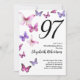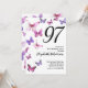 Este convite de 97º aniversário bonito e caprichoso é perfeito para uma festa agradável e estabelecerá um tom divertido e comemorativo. Este design apresenta borboletas rosa e roxas e é uma escolha feminina agradável para um evento especial para celebrar um aniversário marcante. Personalize para o seu próprio ano de aniversário e procure por "97" na minha loja para ver designs coordenados.