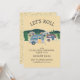 Convite de acampamento com trailer lágrima em um fundo com aparência de papel artesanal em tons de azul e marrom. Personalize com seu próprio texto!