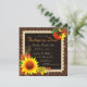 Elegante convite de colheita com girassóis, trigo, bolotas, folhas, cogumelos, frutas vermelhas e um pássaro. Definido em um fundo marrom chocolate com trabalho de pergaminho marrom claro.