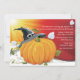 Os raios de sol da manhã correm pela carta, que apresenta uma linda abóbora com um chapéu de bruxa no topo. Duas borboletas brancas e ramos de videira completam a cena. Um convite maravilhoso para as festividades do Dia das Bruxas, para qualquer idade.O convite é fácil de personalizar com seu texto, fonte, cor da fonte e escolha de seis tipos de papel.