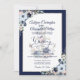 Belo convite de casamento elegante náutico, costeiro ou praia, com uma âncora floral de cor aquosa e buquês florais em cores de azul marinho, branco e rosa poeirento, tipografia de escrita de caligrafia e um dourado de champanhe e fronteira azul marinho na frente. A parte traseira apresenta as iniciais do monograma do casal e a âncora contra um fundo de mármore azul. AJUDA: para obter assistência com a modificação/personalização do design ou a transferência do design para outro produto ou se você quiser coordenar itens, entre em contato com o designer ANTES DE ENCOMENDAR por meio do Zazzle Chat ou makeitaboutyoustore@gmail.com.