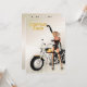 Uma linda moça de bicicleta aponta para o seu convite de festas. Um convite irresistível para homens de qualquer idade.
