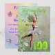 Uma bela fada de flores de bailarina dançando em um convite de aniversário. A bailarina está vestindo um tutu branco, e tem rastros de flores vindas de seu cabelo. Ela está dançando através de um cheio de margaridas.