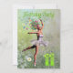Uma bela fada de flores de bailarina dançando em um convite de aniversário. A bailarina está vestindo um tutu branco, e tem rastros de flores vindas de seu cabelo. Ela está dançando através de um cheio de margaridas.