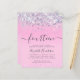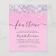 Convite de aniversário feminino amigável com 14 holográfico cintilante, roxo, rosa e prateado, confete com falso brilho contra um fundo rosa e "quatorze" em um roteiro de cinza mole com traços.