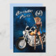 Uma linda moça de bicicleta aponta para o seu convite de festas. Um convite irresistível para homens de qualquer idade.