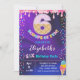 Seis colores bonitos e coloridos de convite de aniversário divertido para a garota. Isso é vibrante com roxo e rosa com cone de sorvete número 6 com muitos borrifos.
