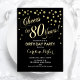 convite de aniversário 80. Design elegante em ouro brilhante e preto. Possui fonte de script na moda e confetti. Saúde para 80 anos! Perfeito para a celebração de um dia de marco feminino ou masculino