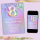 O convite de aniversário 8º, cor-de-rosa púrpura, pinga o 8º convite de aniversário para uma menina de 8 anos com o escrevendo moderno de escrita e balões de folha divertida.
