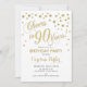 90 Convite de aniversário para mulheres ou homens. Design elegante com ouro brilhante e branco. Possui fonte de script e confetti. Saúde para 90 anos! Perfeito para uma celebração de na moda marco de um dia.