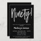 Um convite de aniversário elegante, simples, mas impressionante, preto e 90 prateado. Texto do script Glam na parte superior e texto prateado abaixo com o nome em branco sobressalente