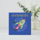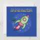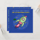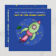 Ilustração de um foguete giro no espaço, rodeado por estrelas e uma pequena espaçonave verde. Também corresponde ao: