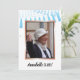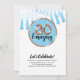 Convite de aniversário de oitenta anos, azul-claro e ouro-rosa. Frente tem uma foto grande (é bom ver a aniversariante!), bruxelas azuis no topo. O verso tem o logotipo "80 e incrível", com os detalhes da festa abaixo.