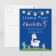 Faça uma festa com este convite de aniversário divertido de llama. Este design apresenta uma sequência de luzes de festa em forma de estrela com um fundo azul escuro com cacto e uma llama decorada com coroa e flores.