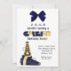 convite de festas de aniversário bonito para a menina que gosta de claque. Ele apresenta um megafone azul e amarelo no canto inferior esquerdo. Um gráfico de um arco azul pende do topo. Você personaliza o texto.